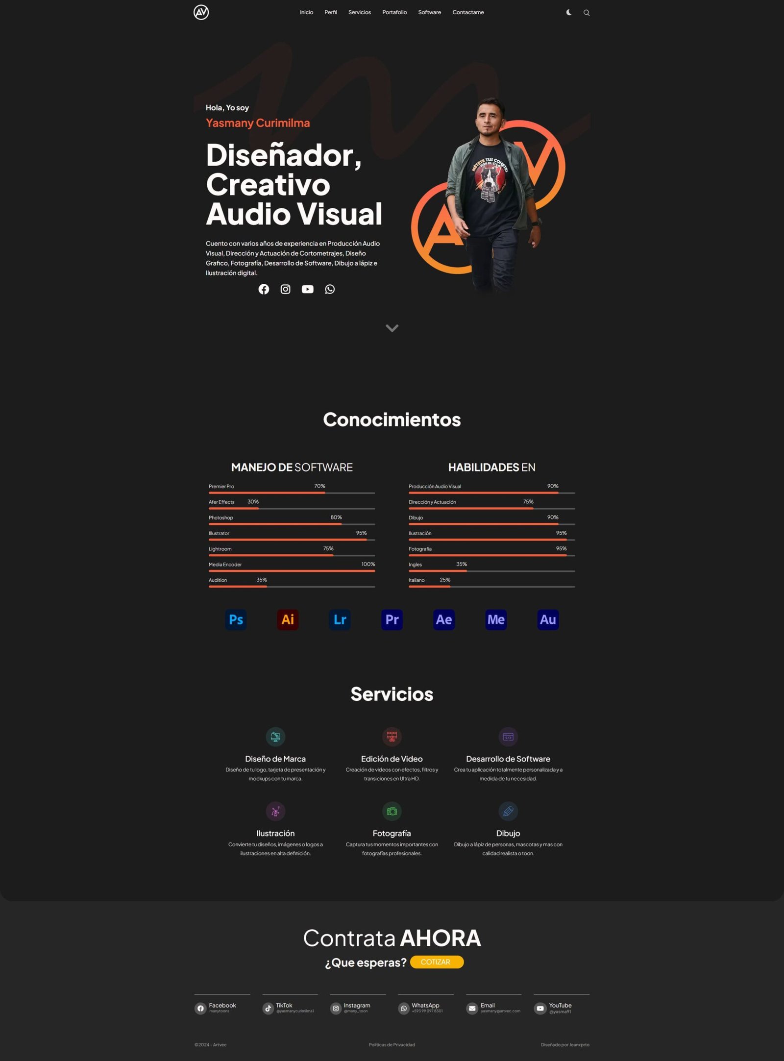 Diseño funcional y visualmente orientado al portafolio creativo. Está organizada por secciones claras (Servicios, Portafolio, Contacto), facilitando la navegación y resaltando trabajos previos con categorías visuales. El enfoque combina elementos visuales (imágenes y videos) con descripciones breves de servicios como diseño de marca y edición de video, lo que ayuda a comunicar competencias creativas de forma directa.: artvec.com
